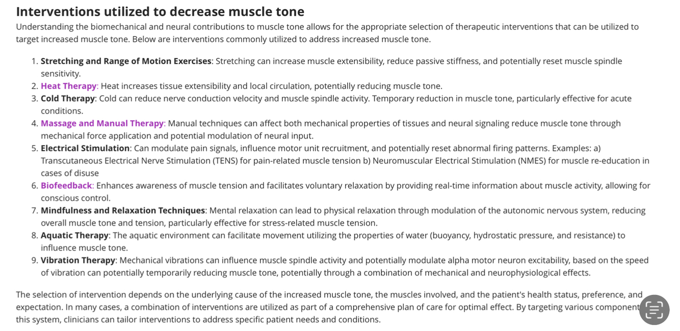 List interventions utilized to decrease muscle tone