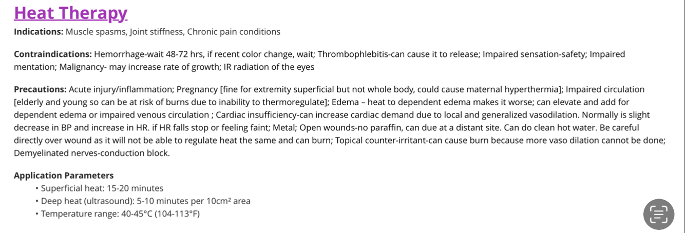 Heat therapy: Explain indications, contra indications, precautions, and application parameters