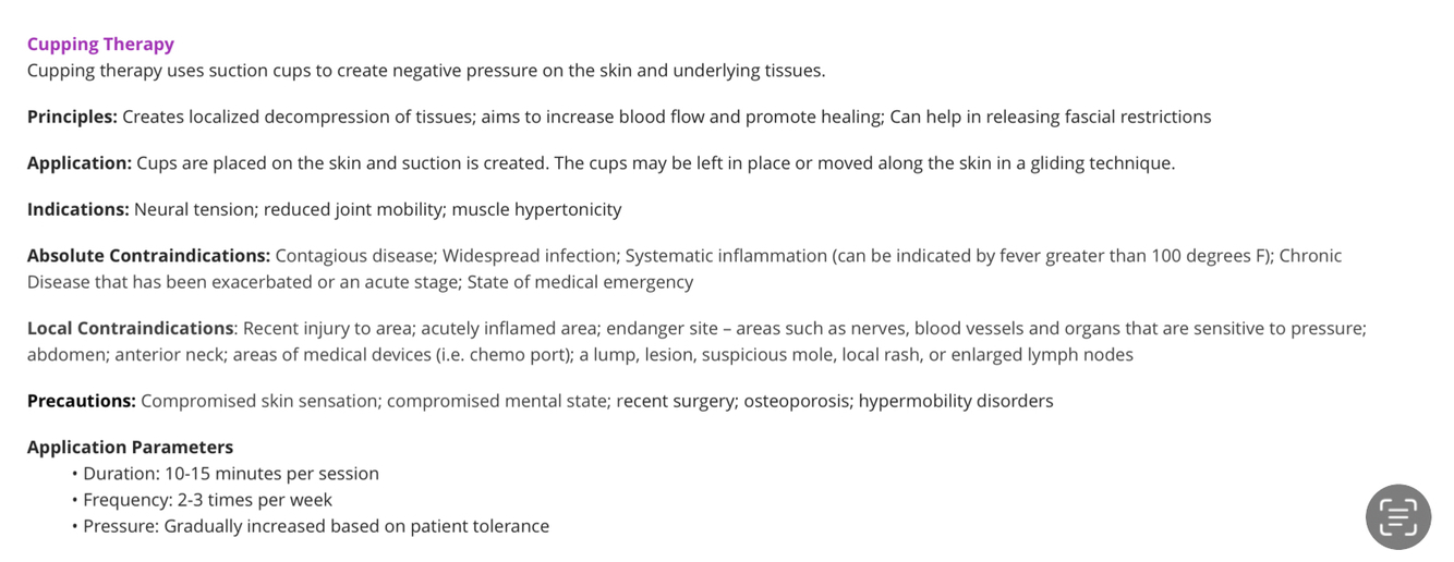 Cupping therapy: Explain principles, application, indications, absolute/local contraindications, precautions, and application parameters