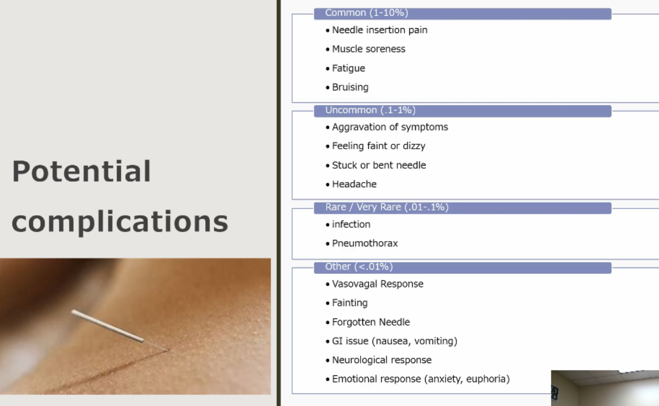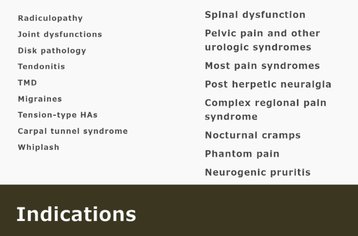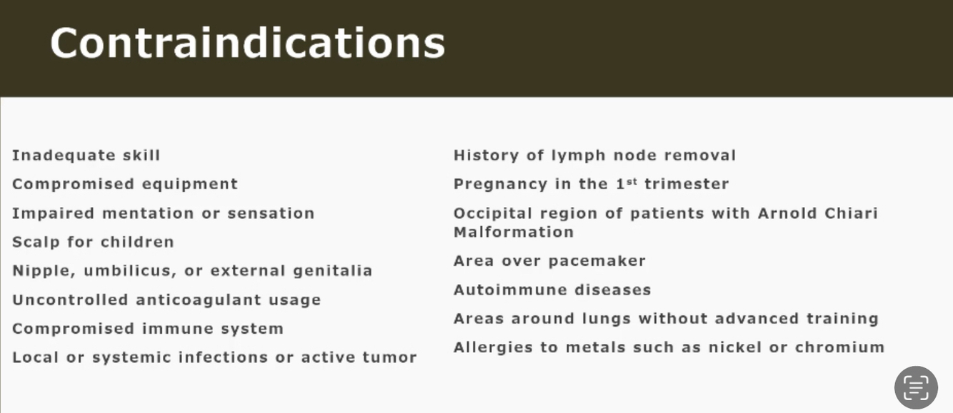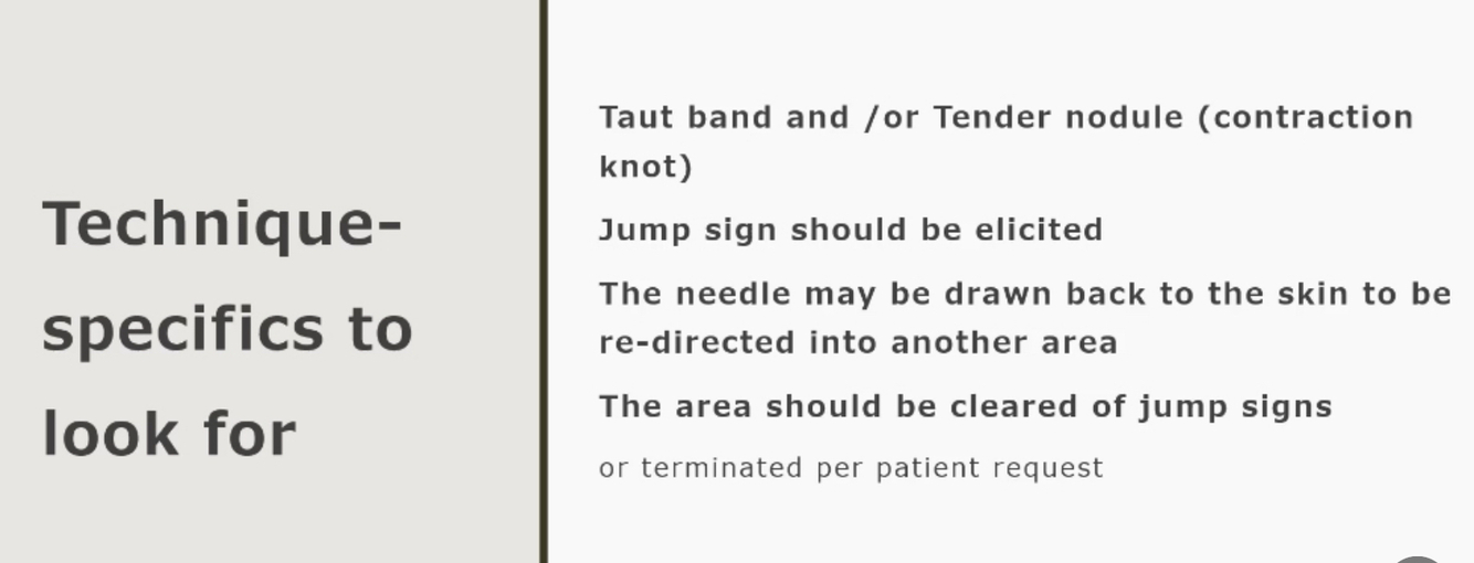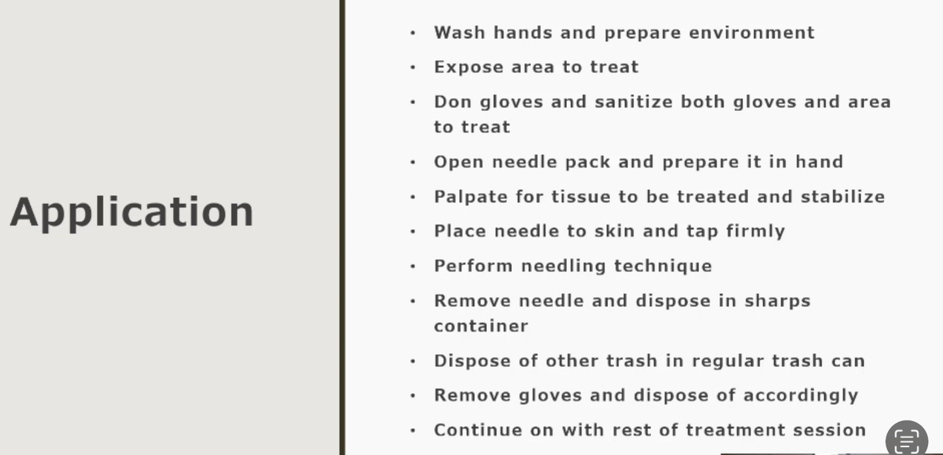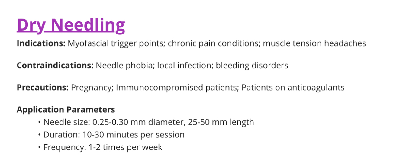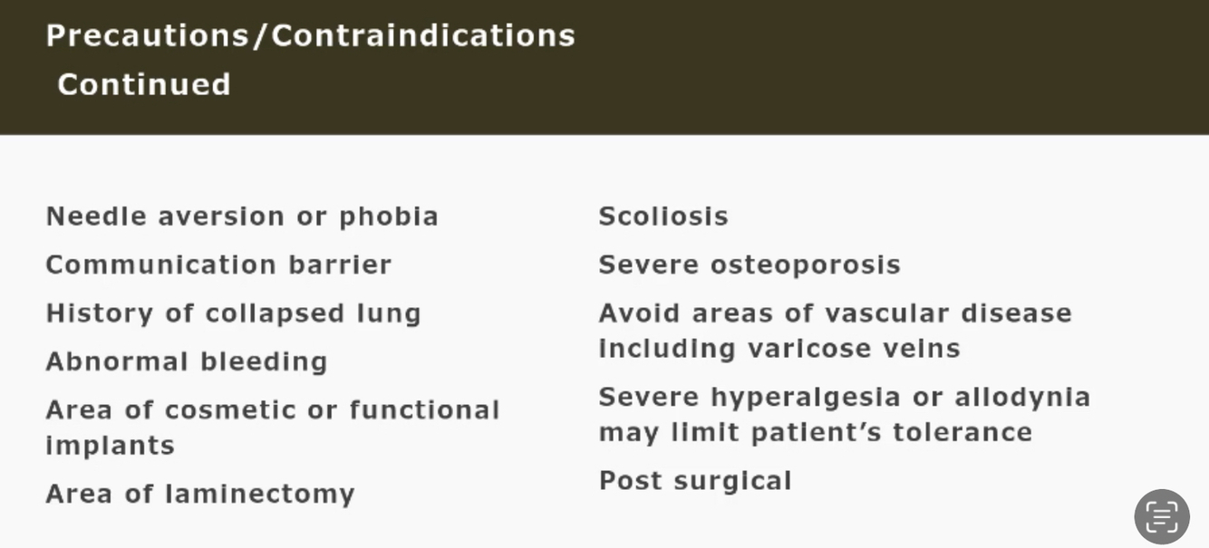 Explain indications, contra-indications, precautions, and application parameters for dry needling