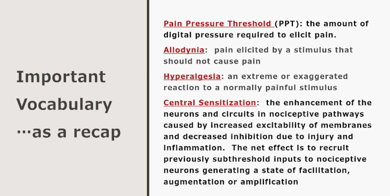 Define PPT, Allodynia, Hyperalgesia, Central sensitization