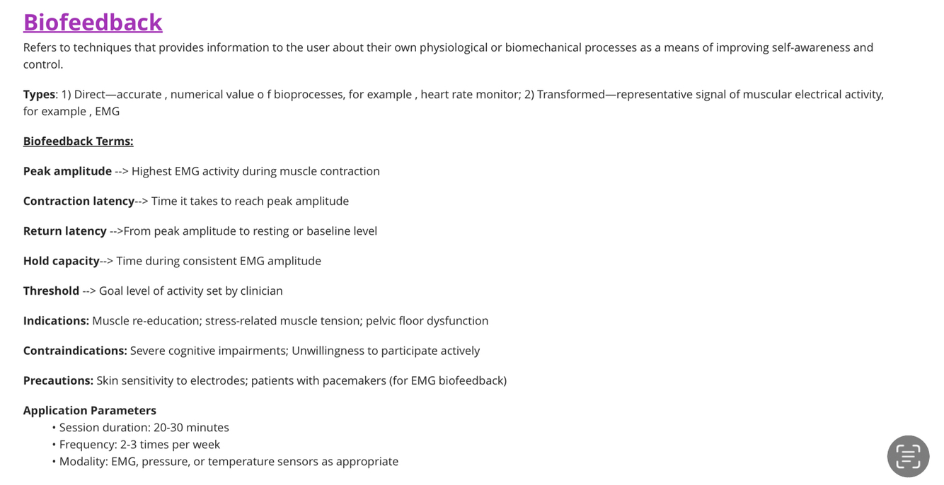 What are the types and application parameters for biofeedback techniques?