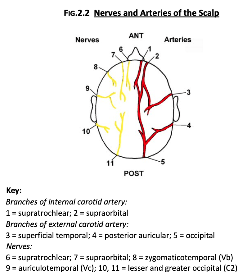 Posteriorly, the scalp is supplied by the greater occipital and third occipital nerves, branches of the posterior rami of C2 and C3 respectively and laterally by the lesser occipital (C2) and auriculotemporal (branch of Vc) nerves