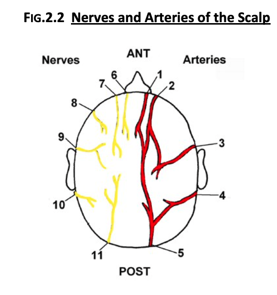 The scalp is supplied by branches of the external and internal carotid arteries: superficial temporal and posterior auricular arteries (ECA); supraorbital and supratrochlear arteries (ICA).