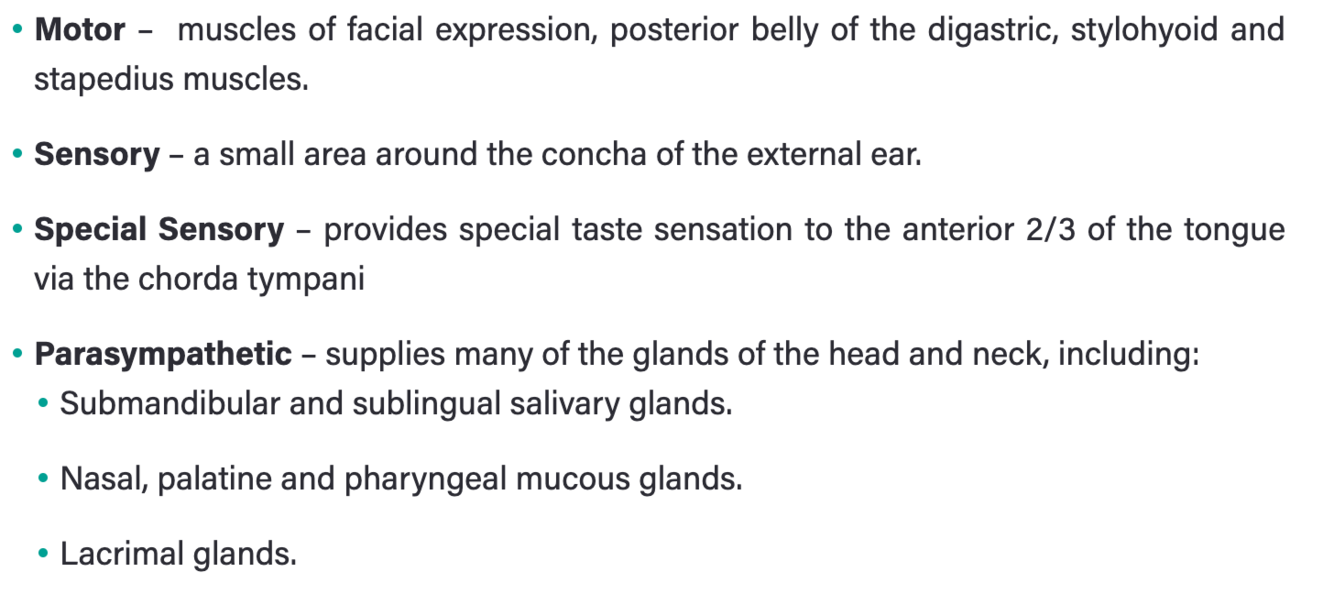 it carries preganglionic parasympathetic fibres destined for the lacrimal, submandibular, sublingual and nasal mucous glands, and taste fibres from the anterior two-thirds of the tongue via its chorda tympani branch