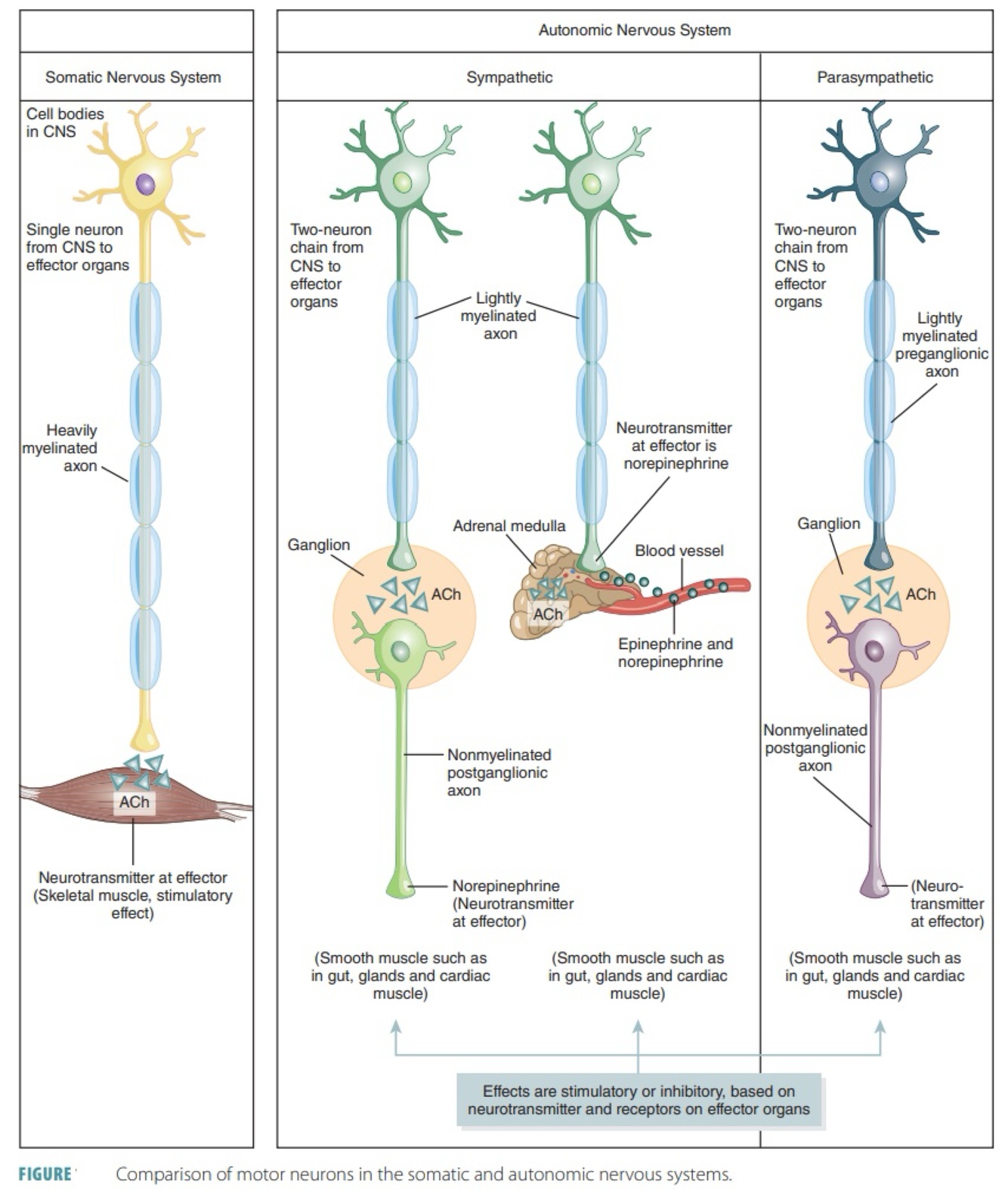 compare and contrast the architecture of the SNS & PNS efferent pathways