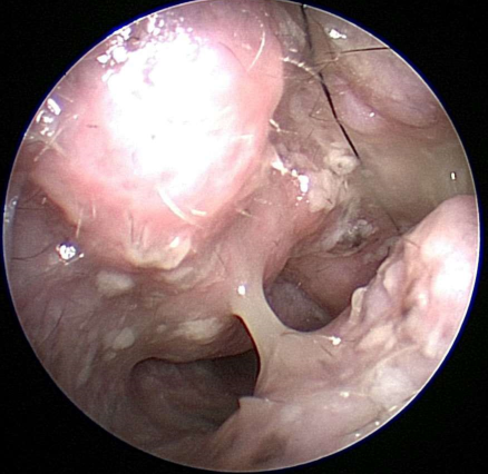 Evaluation of the tympanic membrane and allows use of topical antiseptic