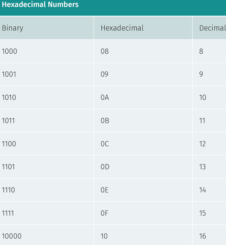 It is a base-16 system, 16 possible symbols. It is the preferred method to use for translating binary to decimal. It’s written in groups of two