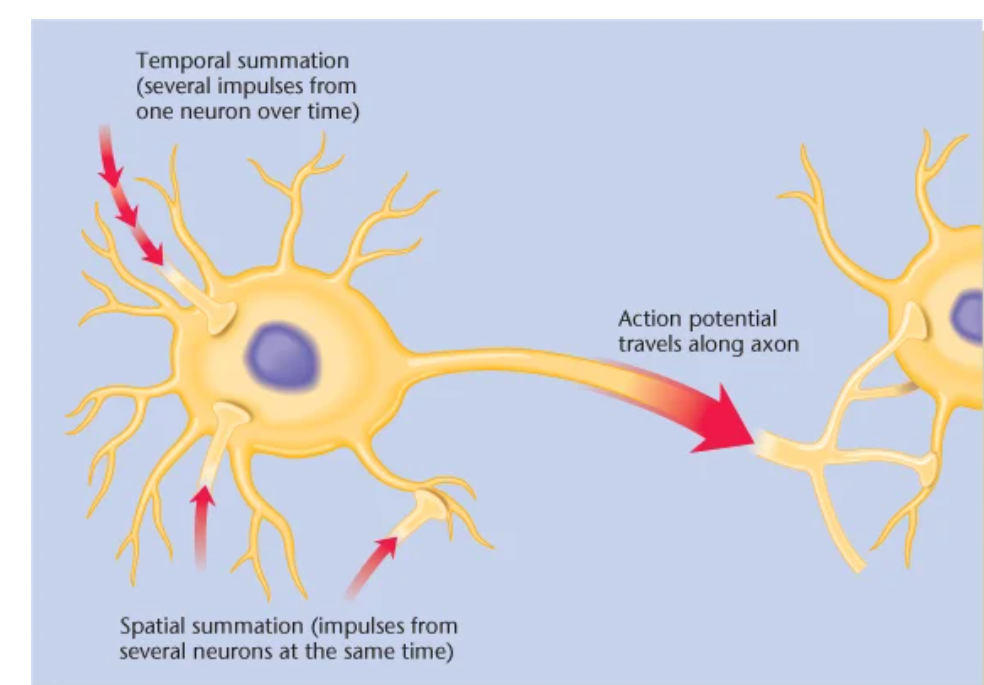 Synaptic inputs from separate locations combine their effects on a neuron.