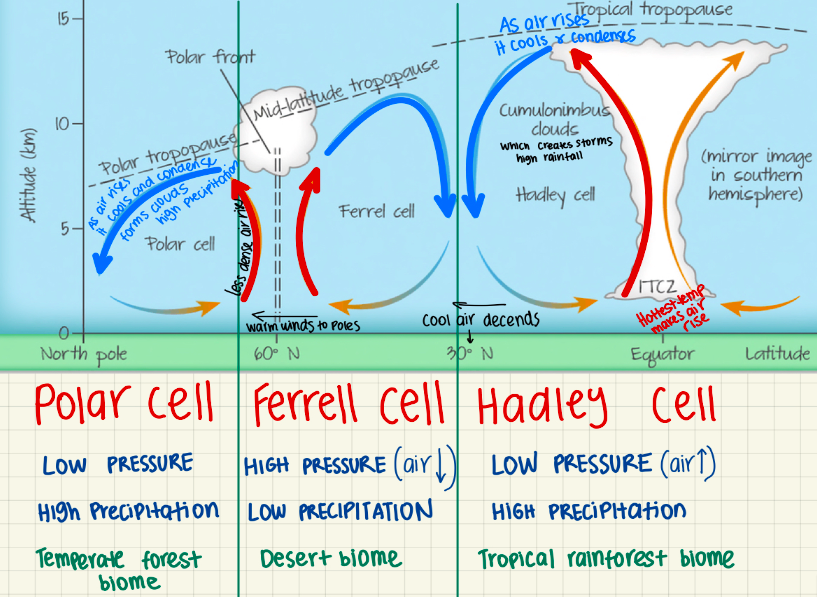 Then, as the air decends 30 N and S of the equator, a desert biome can be found in the ferrell cell.