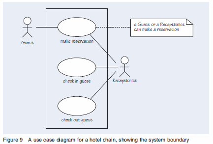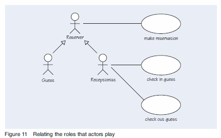 An actor in a use case diagram represents a particular role that an individualmight play when interacting with a software system. For example, a receptionist checks guests into and out of a hotel (see Figure 9). But it could be that the person who works as a receptionist at one hotel becomes a guest at another hotel in the chain and hence takes on another role.