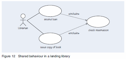 The «include» stereotype indicates a situation where a use case is reused. In Figure 12, the diagram illustrates the check reservation use case, which is used by two other use cases. The purpose is to demonstrate commonality between tasks so that reuse can be achieved. The additional use case is included unconditionally in the original, or base, use case.