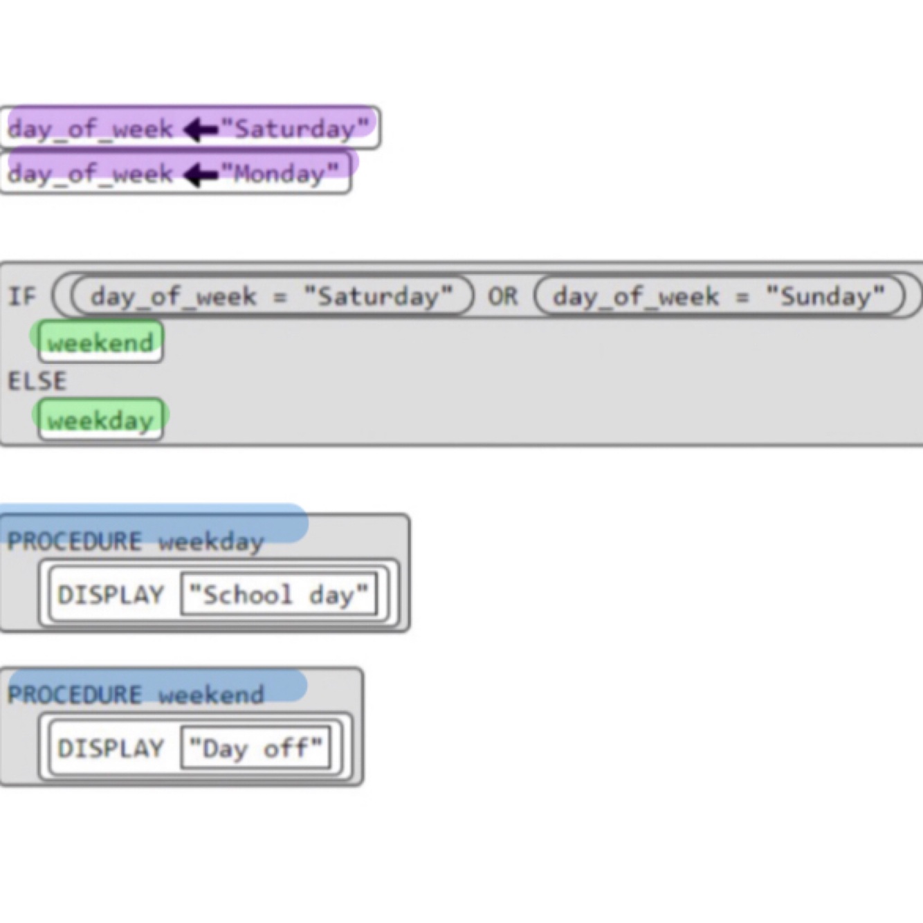 sat -> mon, mon != sat or sun so “else”, “else”=weekday, weekday= SD