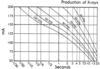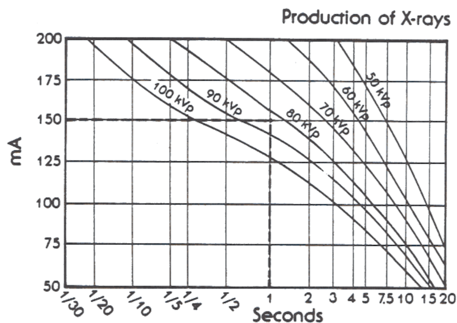 X-axis: exposure time (seconds), Y-axis: tube current (mA), Curves: specific kVp values.