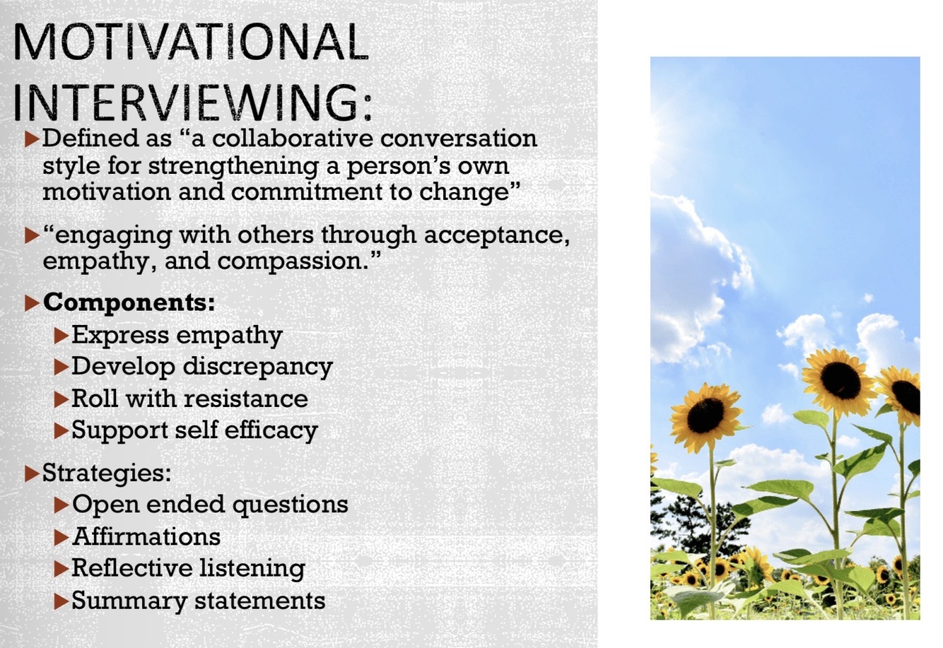 Give examples of motivational interviewing