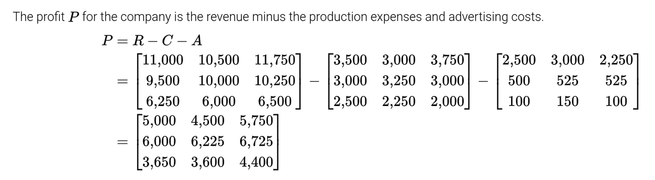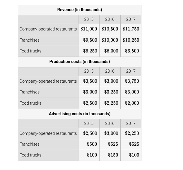 A food services company has company-operated restaurants, franchises, and food trucks. The revenue and expenses for three years for each of these categories are shown in the spreadsheet below. Use matrix algebra to determine the yearly profit from each food service category.