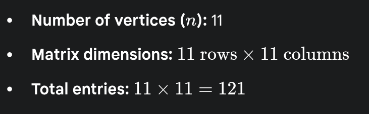 What is the number of entries in the adjacency matrix of a graph having 11 vertices?
