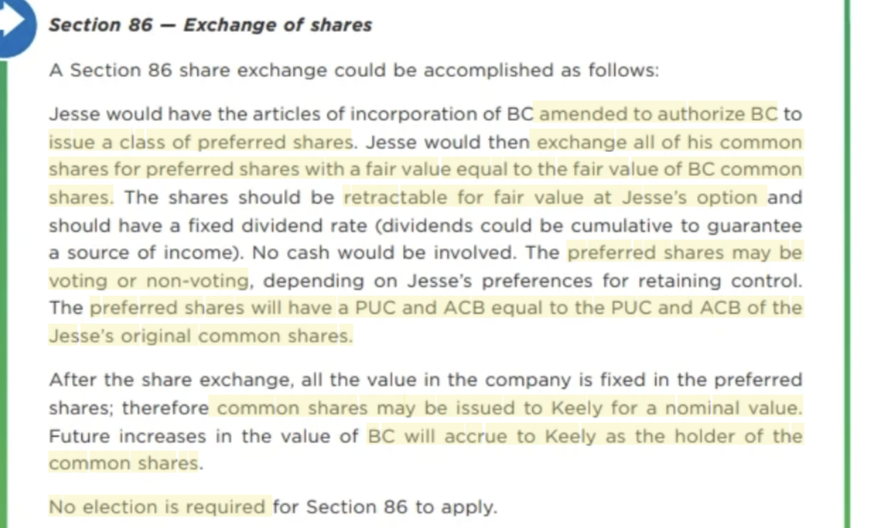 b) no tax will be paid on CG if Opco trf the common shrs at an elected value sufficient to use up remaining CGE–> may trigger S.84.1 if NSC taken back> org PIC on shrs transfer