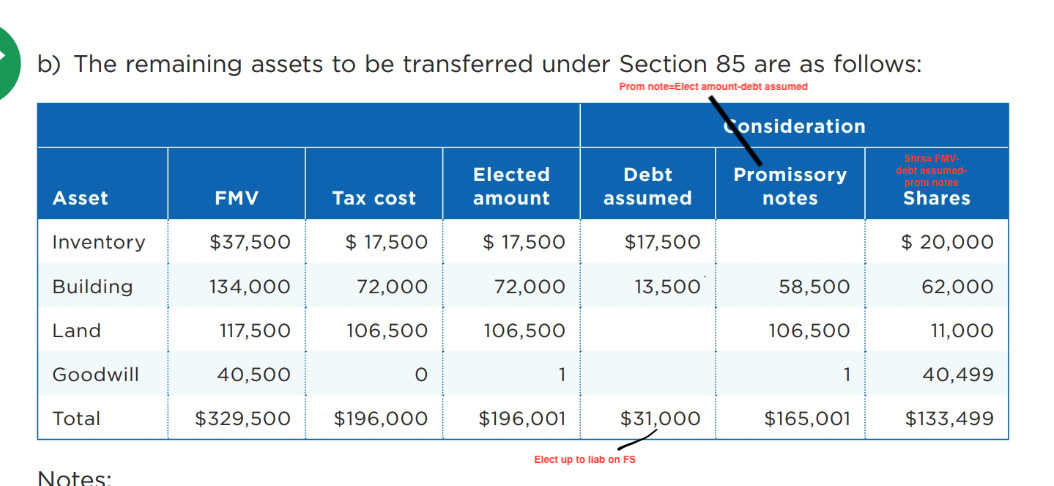 a)corp will assume all debt of the proprietorship as NSC, afterward it will issue promissory notes = to the elected amount (tax cost)–> total NSC=elected amount
