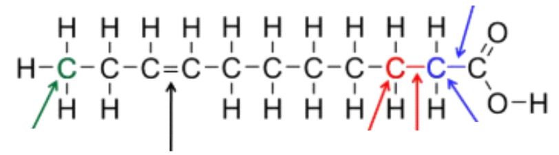 When all carbons in the chain are connected with a single bond, they results in “saturated fat” because the have the maximum about of hydrogen atoms possible (saturated with hydrogen).