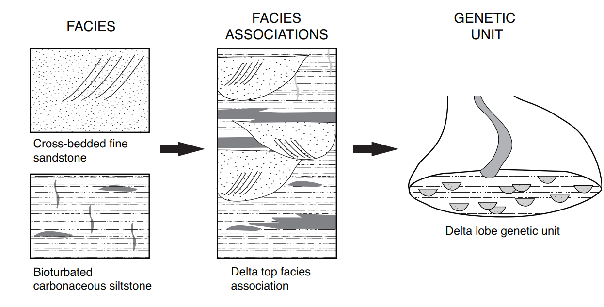 Example: a delta lobe would form a genetic unit, containing several sandstone facies (channel deposits) as well as mudstone, siltstone and coaly facies deposited in inter-channel areas.
