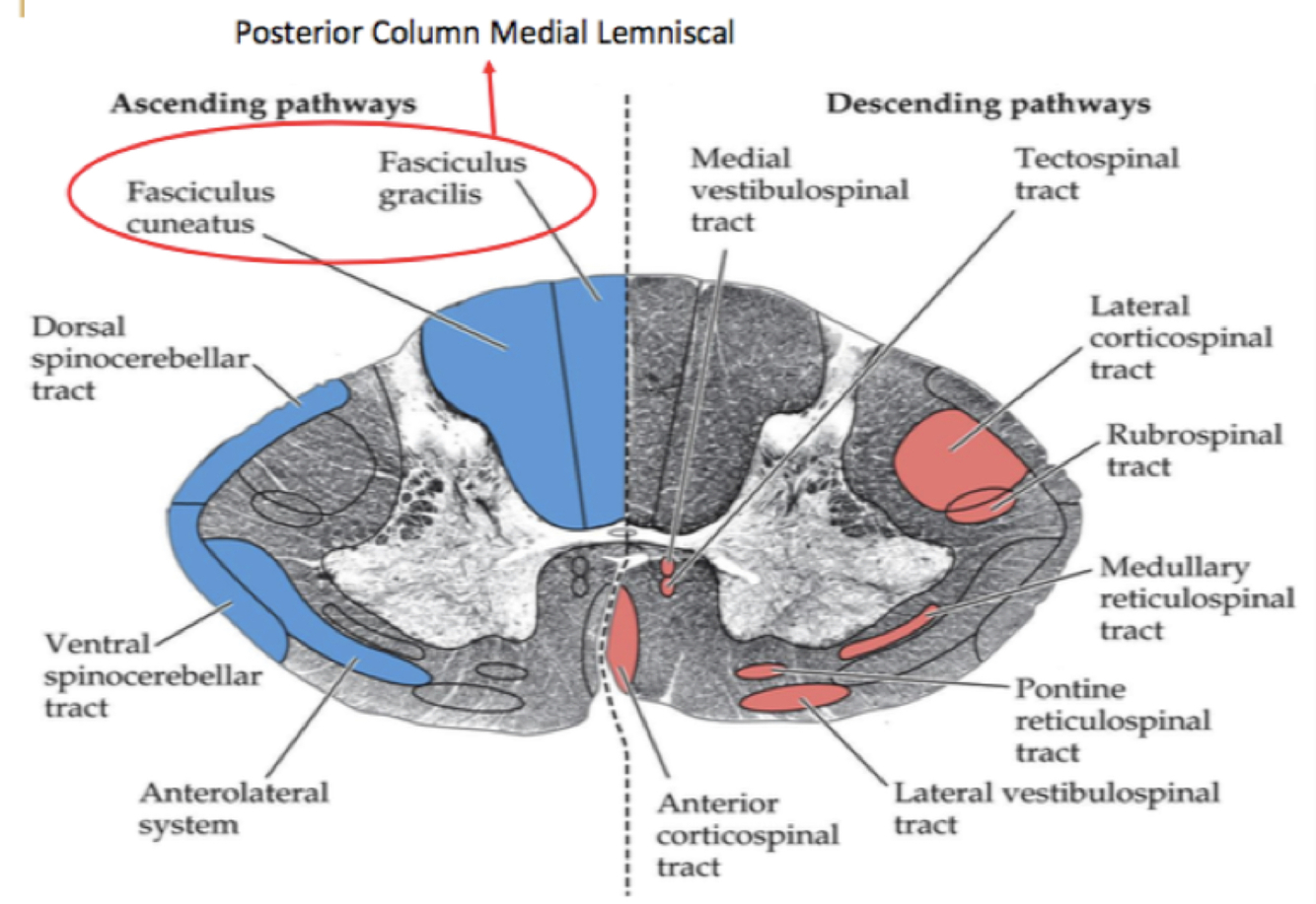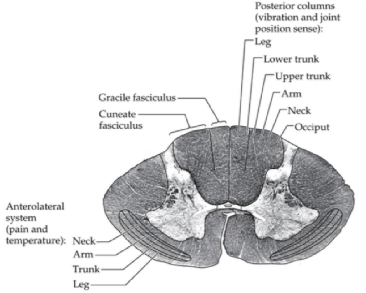 PCML (vibration, proprioception, fine touch) -UE: Lateral (faciculus cuneatus) -LE: Medial (faciculus gracilis) ALS (pain, temp, crude touch) -UE: Medial -LE: Lateral