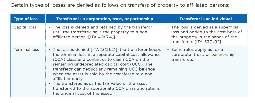 - Corp, trust, partnership, individuals: loss are denied, transferor keeps TL in a separate CCA class until its sold to 3rd party
