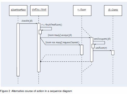 The Room object will receive different messages depending on which branch is executed in the Hotel object. It makes no sense for the messages to arrive at just one lifeline, as that would imply that the Room object received all of the messages in a single interaction. Instead, we show a fork in the lifeline of the receiving object to reflect the fork of control in the sending object.