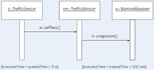 The sendTime and receiveTime properties of a message or a signal are used to express a timing constraint. In addition, a message label is required to express the time difference between the start and end points, as shown in the examples in Figure 8.