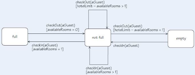 The example in Figure 20 is incomplete. Figure 21 deals with both extremes – when the hotel is full and when it is empty – as well as the possible configurations between full and empty. This results in checkout(aGuest) occurring in three transitions, two of which (from not full to empty and from not full to not full) require guards to ensure mutual exclusion between them. For completeness, we added a guard to the remaining checkout(aGuest) event (from full to not full) as a check on the mutual exclusion between all three uses of checkOut(aGuest).