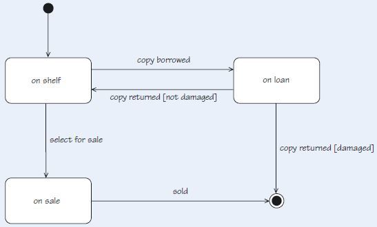 Figure 22 shows a simple statechart diagram for the class Copy. What should happen if the copy returned message arrives when an object of the class Copy is in the state on shelf (assuming that we are not using Design by Contract)?