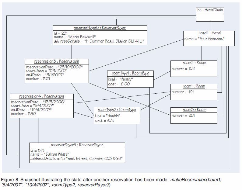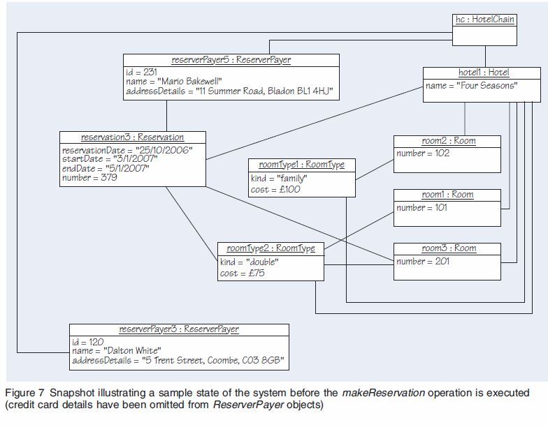 Consider the snapshot in Figure 7, and draw a snapshot after the execution of the system operation makeReservation(hotel1, “8/4/2007”, “10/4/2007”, roomType2, reserverPayer3).