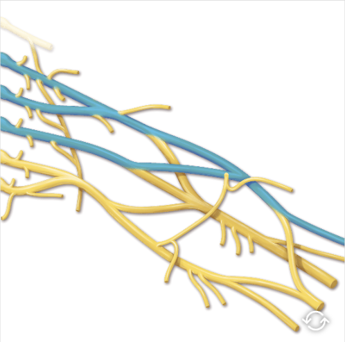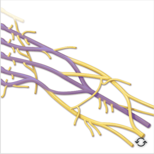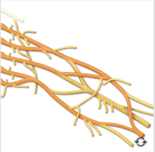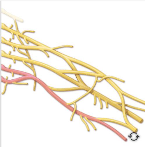 primary terminal branches: medial, radial, ulnar | reside in neurovascular bundle