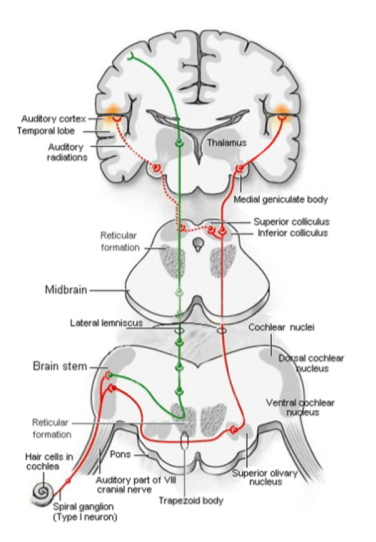Cochlea, cochlear nerve → pontine level brainstem → inferior colliculus of midbrain → medial geniculate nucleus of thalamus → acoustic radiations of internal capsule (sublenticular part) → primary auditory cortex → superior bank of sup. temporal gyrus and Heschl’s gyrus