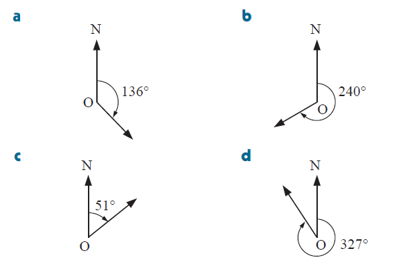 The true bearing of B from A is the clockwise measure of the angle between [AB] and the ‘north’ line through A.