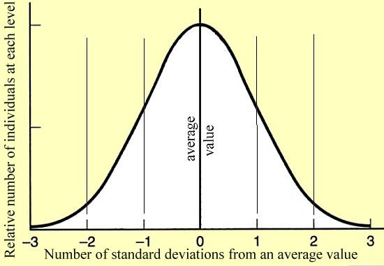 A graphical representation of the spread of a normal dataset indicating 1, 2, and 3 standard deviations from mean.