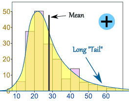 Also known as positively skewed, the bulk of the data items are clustered on the negative end of a graph with the long tail to the right.