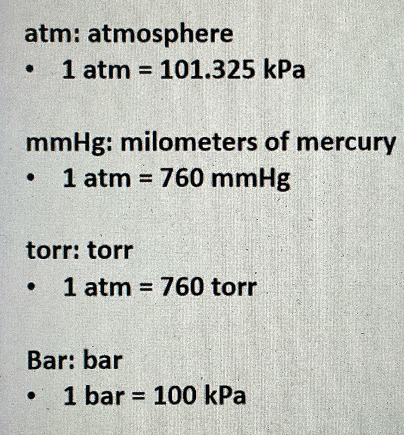 Atm, kPa, mmHg, torr, bar