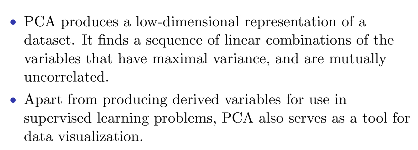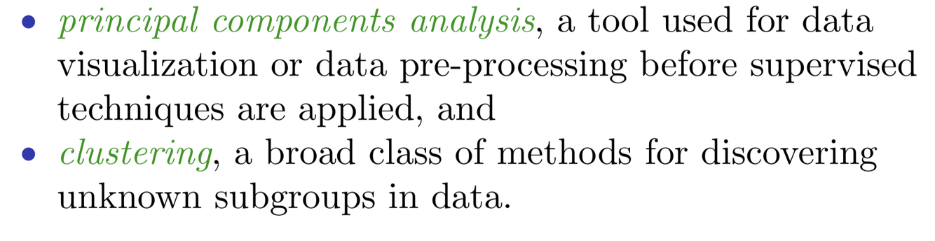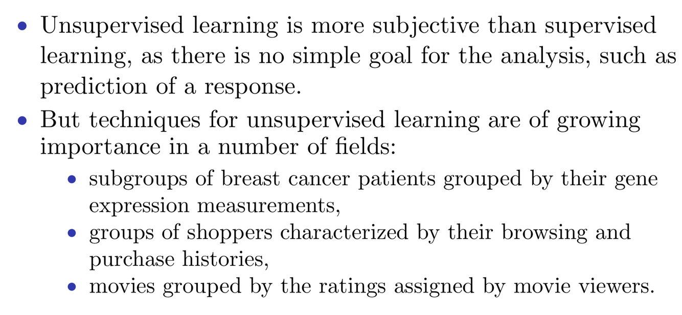 unsupervised learning, we where observe only the features X1, X2, . . . , Xp. We are not interested in prediction, because we do not have an associated response variable Y .