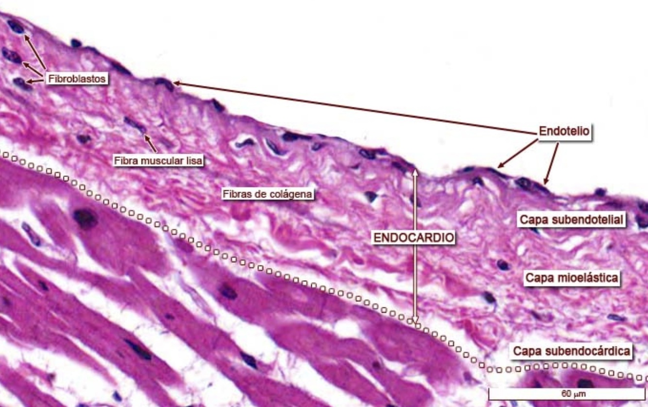 - Subendocardio: Tejido conectivo laxo, células de Purkinje, adipocitos y músculo liso.