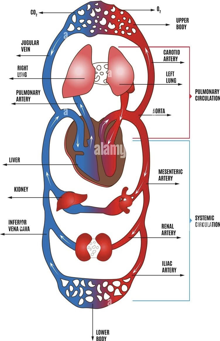 Aorta ⇢ Arterias de gran calibre ⇢ Arterias de medio calibre ⇢ Arterias de pequeño calibre ⇢ Esfínteres precapilares ⇢ capilares ⇢ Vénulas ⇢ Venas de pequeño calibre ⇢ Venas de medio calibre ⇢ Venas de gran calibre.