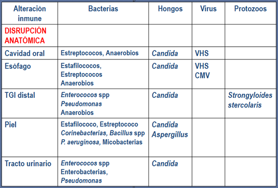 Cuales son los microorganismos más comunes de causar infecciones por disrupción anatómica en inmunocomprometidos?