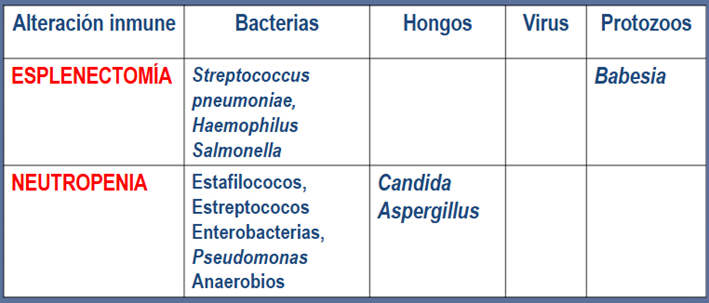 -Por alteraciones de la inmunidad humoral, se altera la capacidad de opsonizar y los microorganismos capulados producen infecciones mortales y graves: strep pneumoniae, haemophilus influenzae, klebsiella pneumoniae