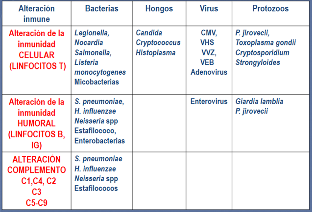 -Por alteraciones de la inmunidad celular (microorganismos intracelulares): micobacterias, salmonella, toxoplasma, pneumocystis jrovecci, virus).