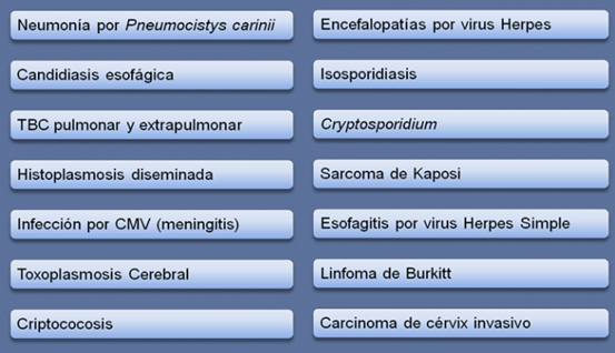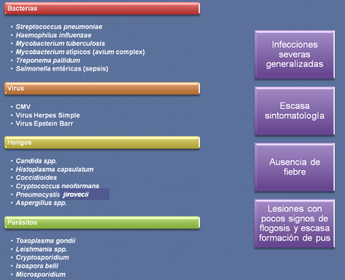 CMV, candida, herpes, micobacterias, toxoplasma, histoplasma, coccidioides, reactivación de infecciones latentes.
