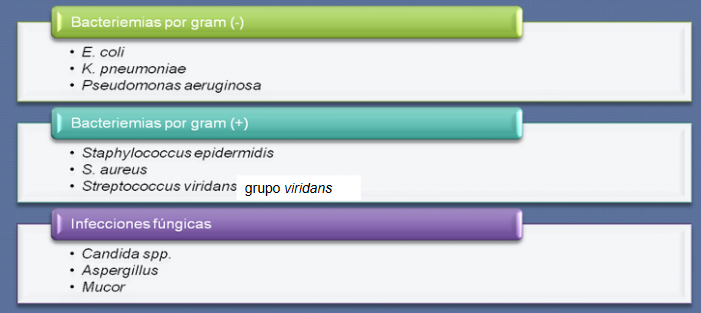 En pacientes transplantados de medula ósea es más común: staphylococcus, enterobacterias, pseudomonas y hongos.