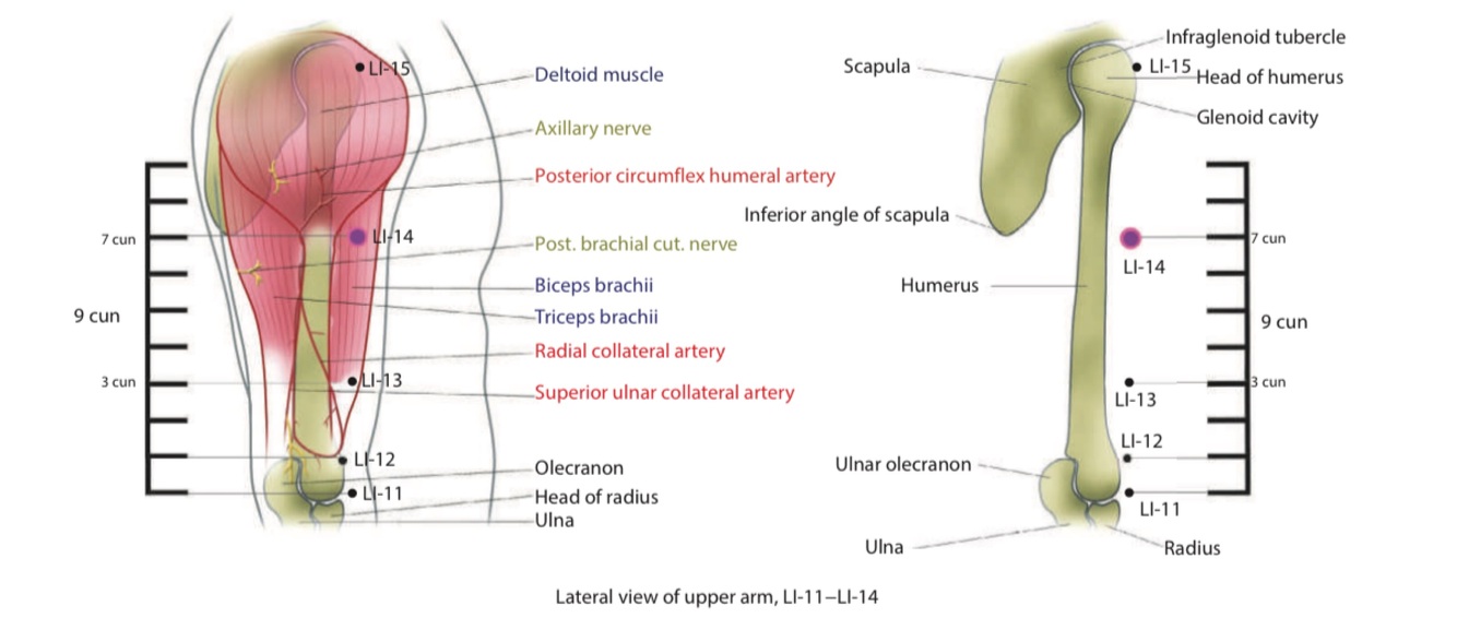 Ask the person to abduct their upper arm to expose the deltoid muscle. Find the ‘V’ of the insertion of the deltoid, on the upper arm. With the arm relaxed by the person’s side and the elbow bent, feel for the point just anterior to this insertion, on the line connecting LI 12 - LI 15. The point lies here at 7 cun above the flexure of the elbow.