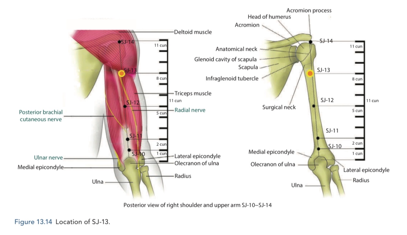 On the posterior aspect of the humerus, on the line con- necting the tip of the olecranon and SJ-14 (jian liao), 3 cun below SJ-14 (jian liao), and on the posterior and inferior bor- der of the deltoid muscle.