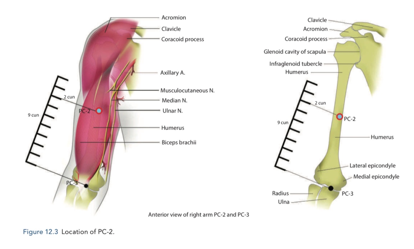 7 cun above the flexure of the elbow (Pc 3), between the two heads of the biceps muscle. The easiest way to identify the point is to ask the patient to move their arm in two ways to reveal the cun and muscle landmarks. Ask the patient to raise their forearm against the resistance of your hand to highlight the biceps