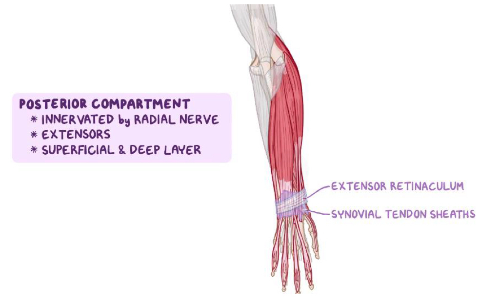 What types of muscles are contained in the posterior compartment of the forearm?
